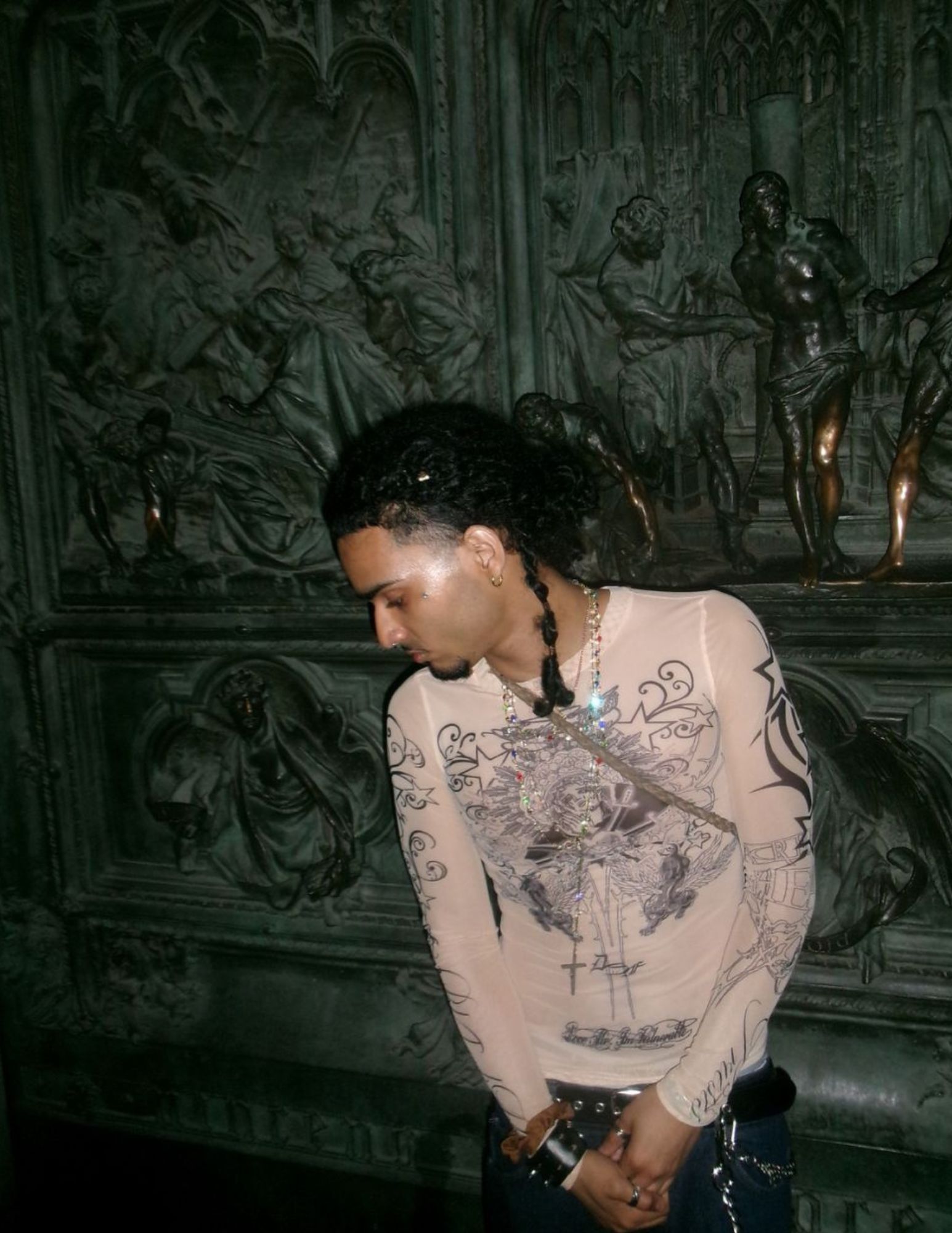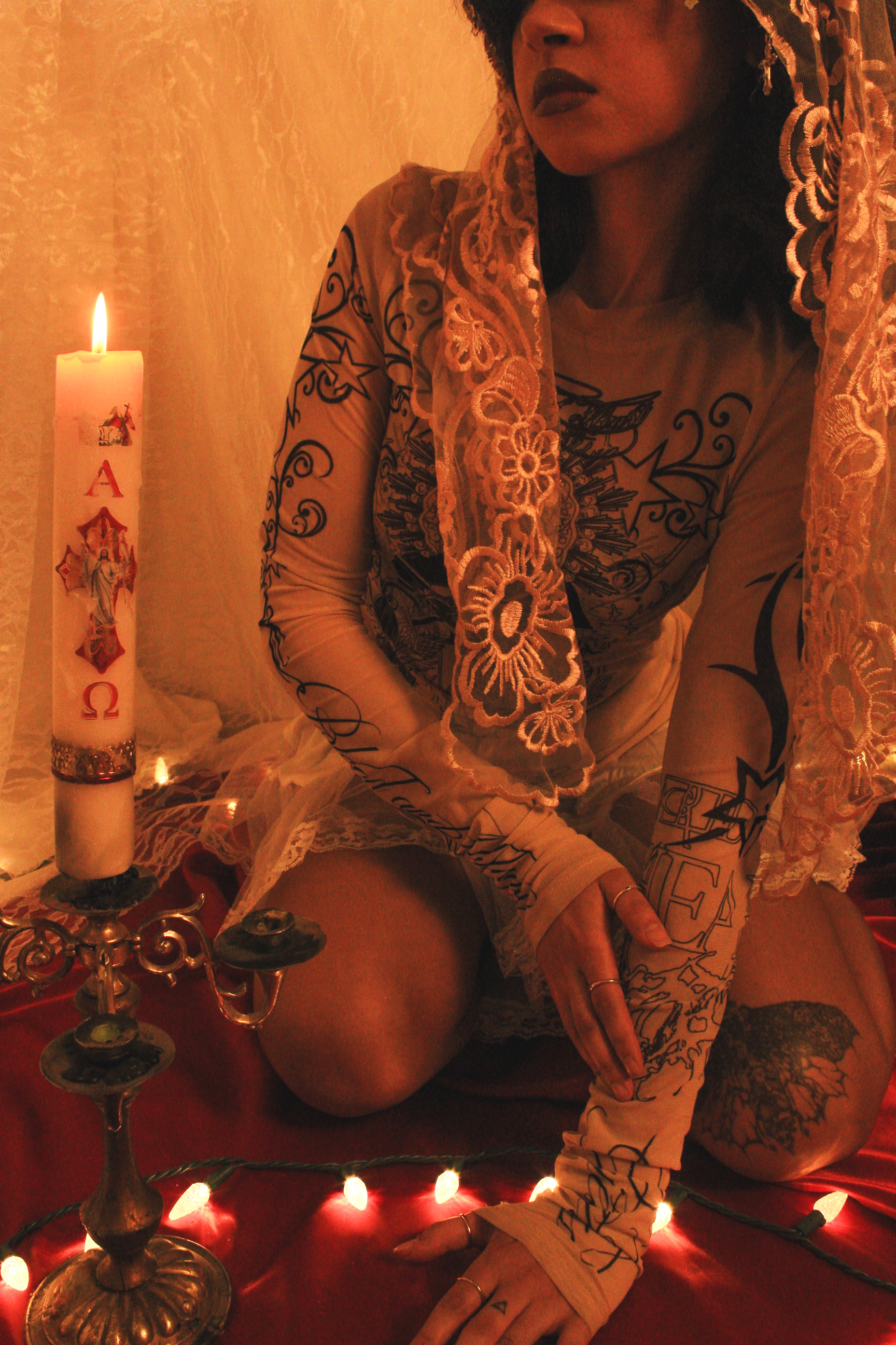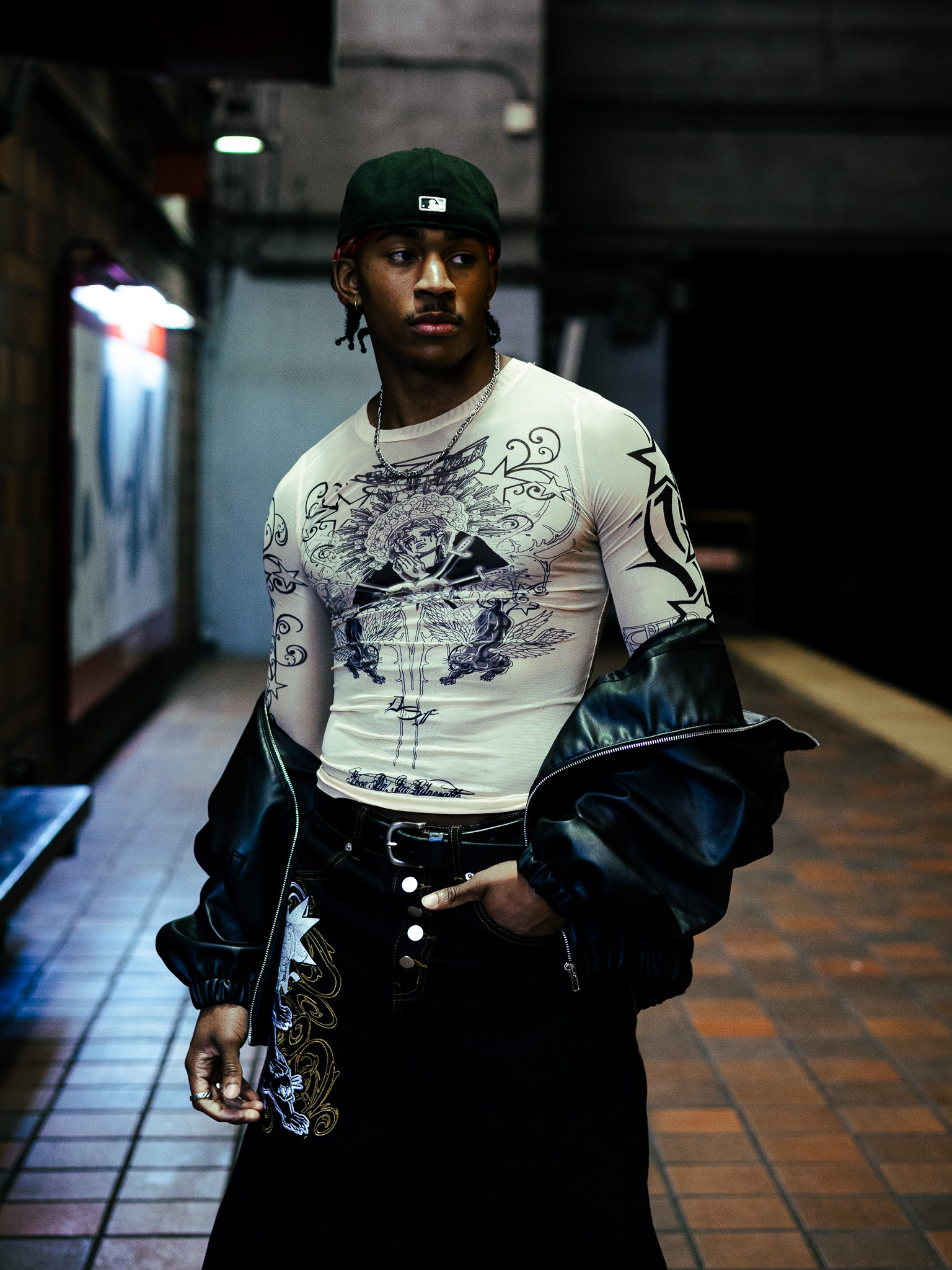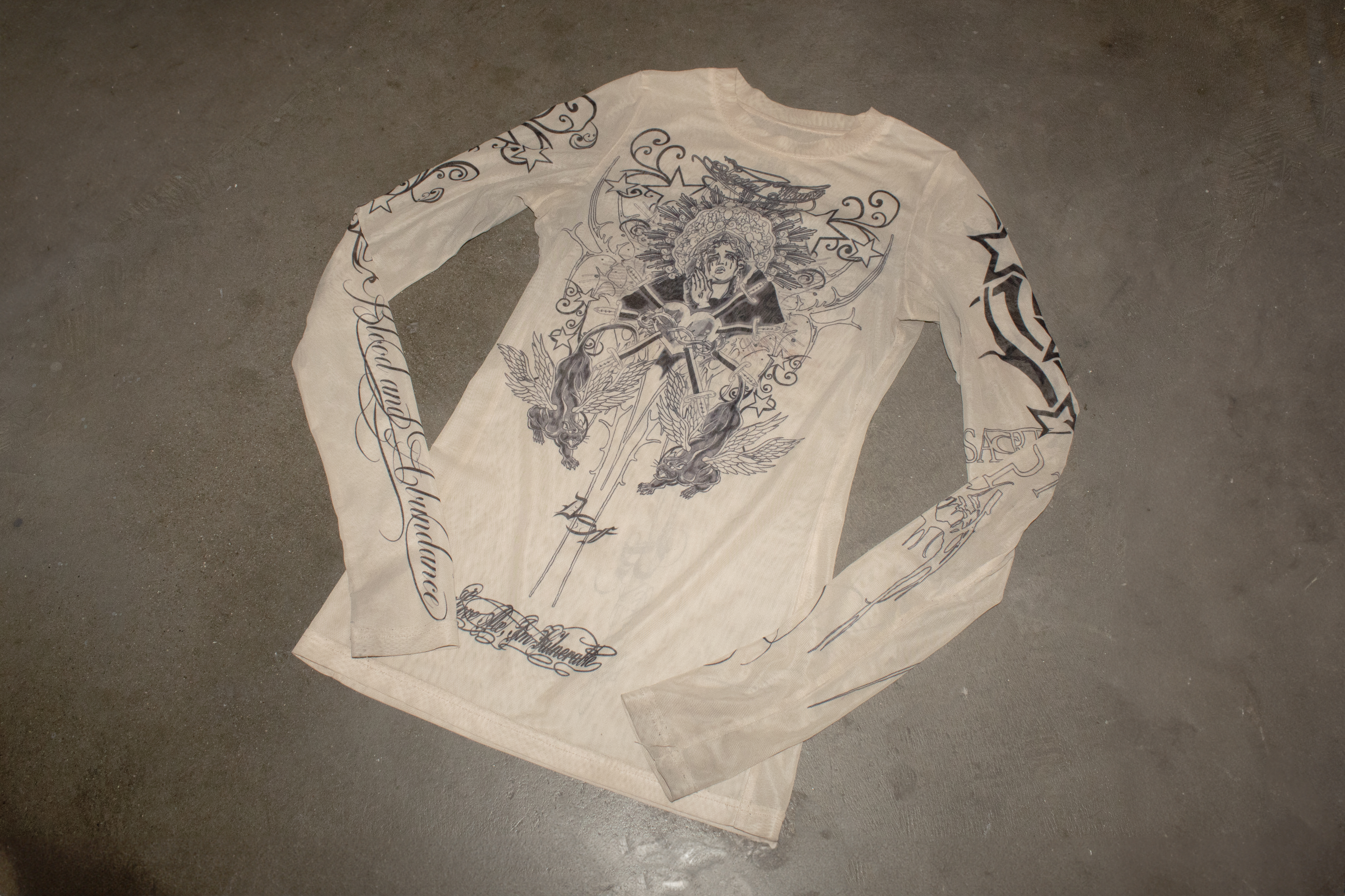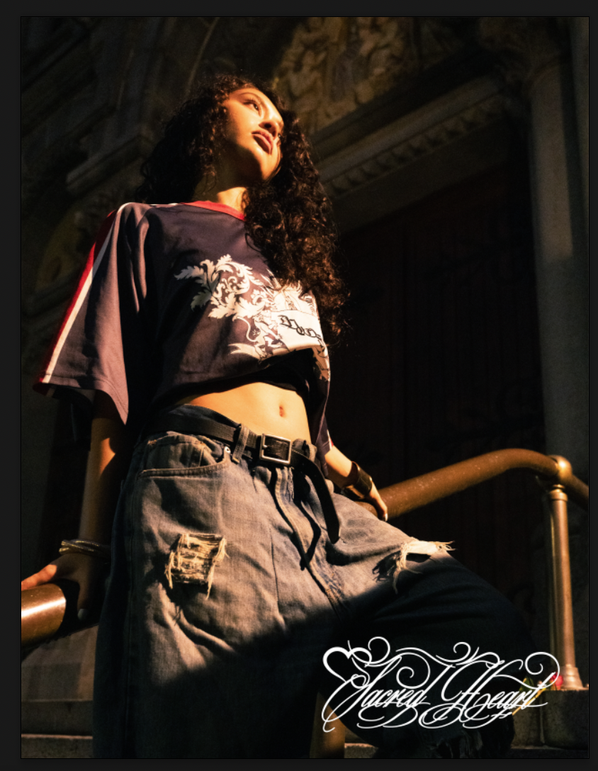 The visual language merges references from European Catholic iconography and Mesoamerican spirituality, recontextualized within streetwear and alternative fashion. These elements are not decorative, they function as a framework for reframing identity, transforming the body into something sacred, self-defined, and resistant.