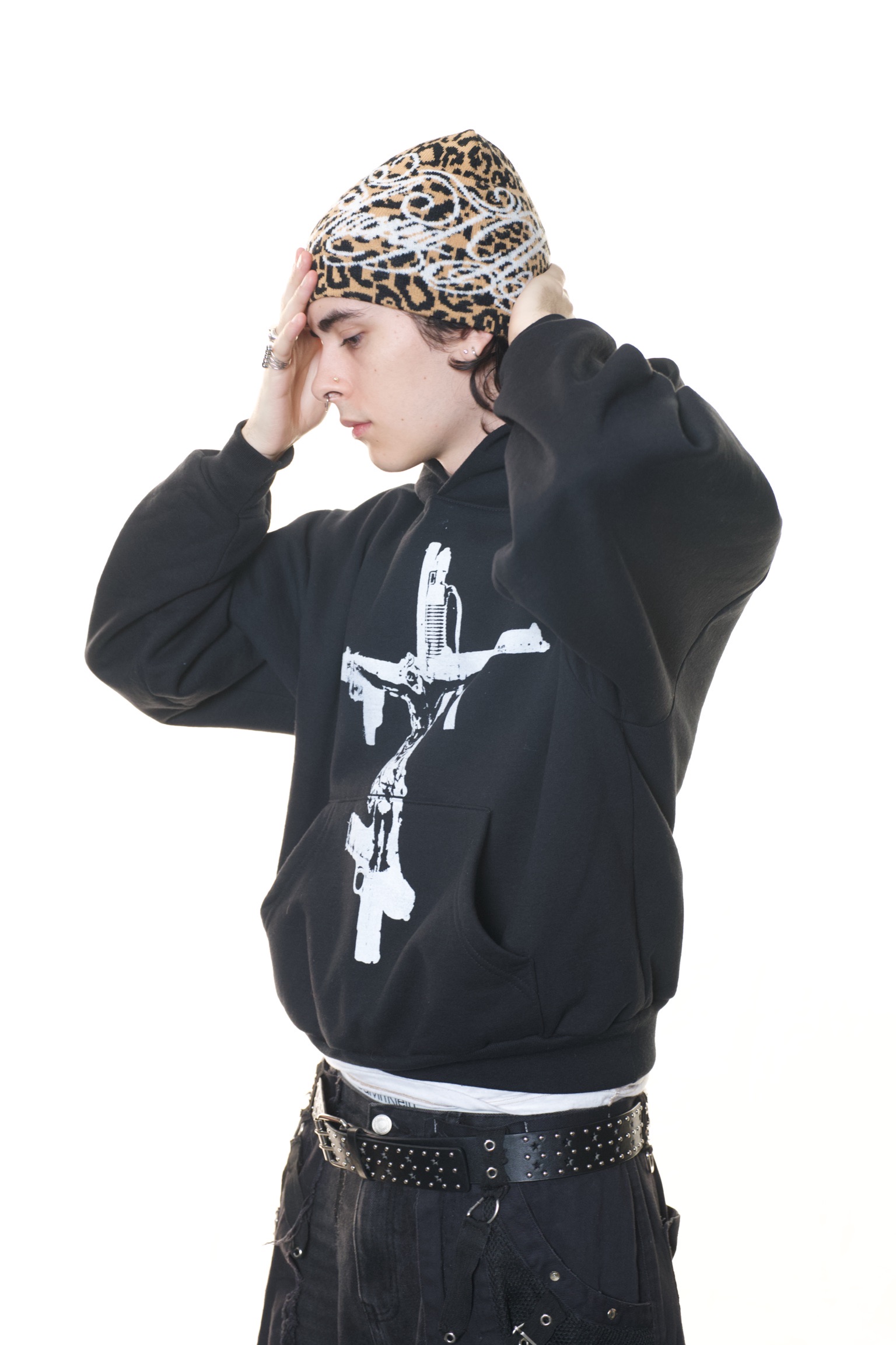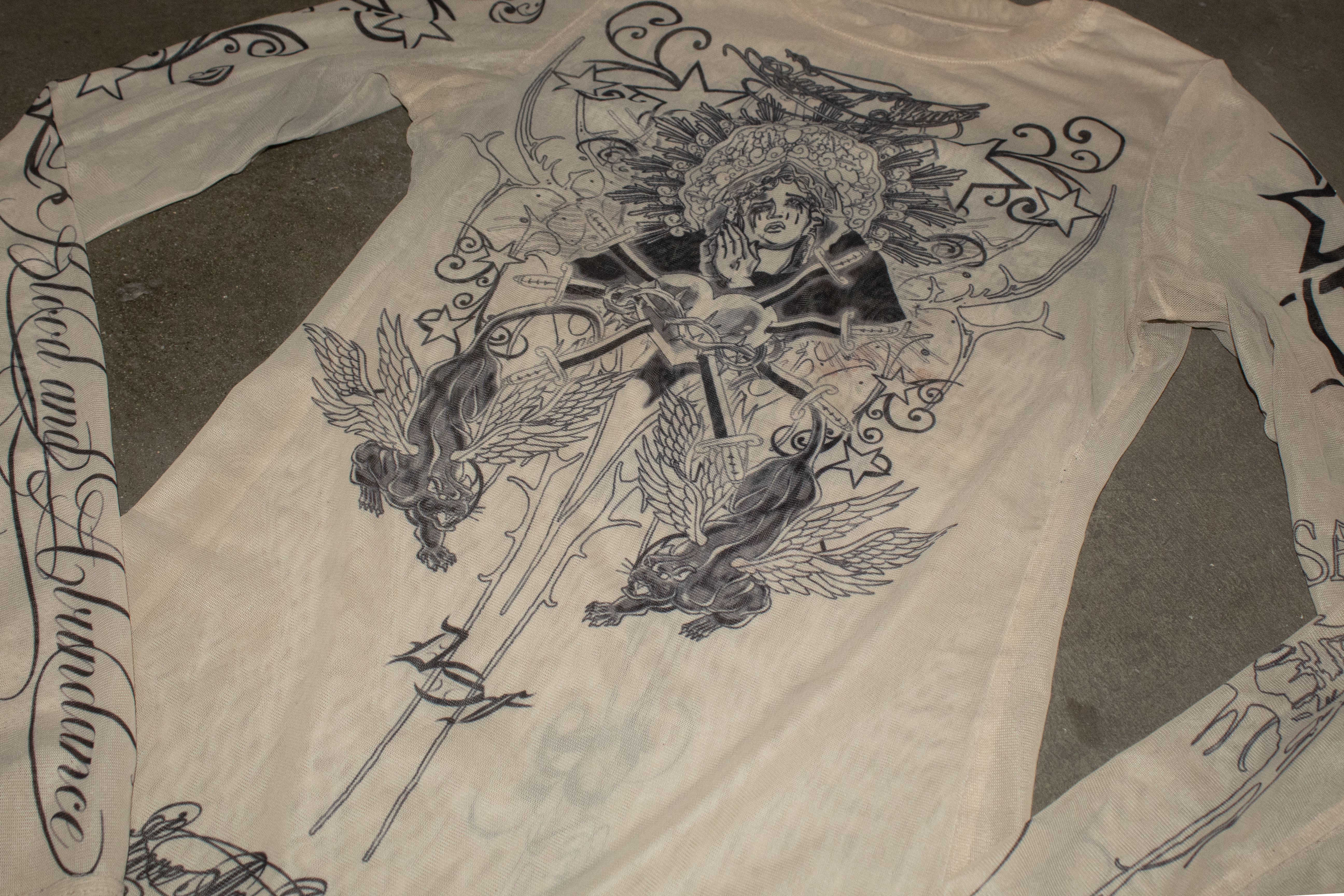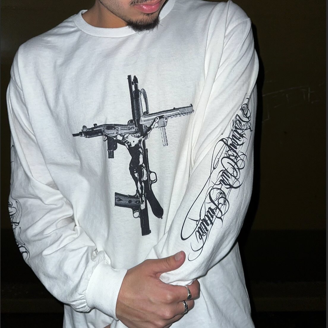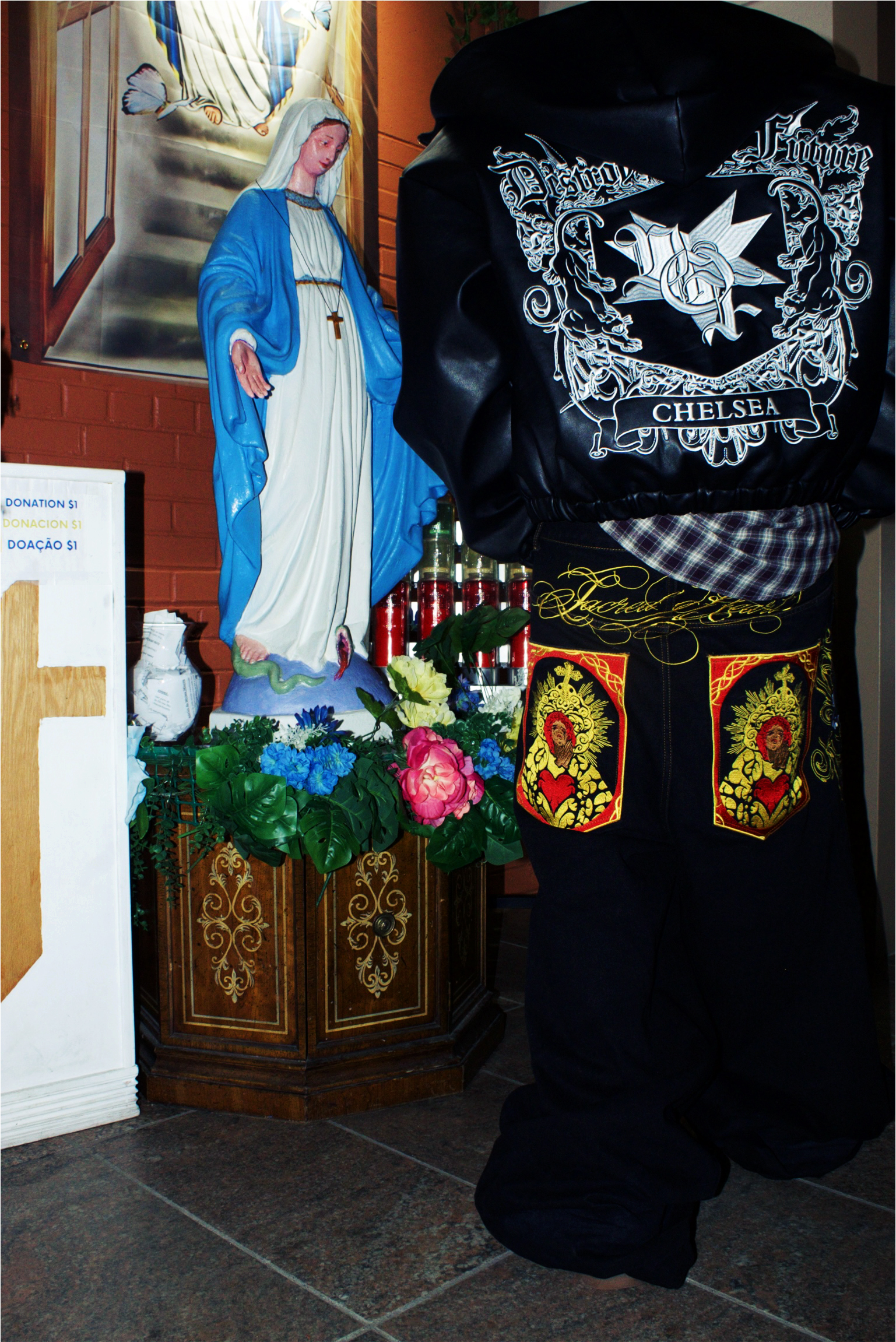 The visual language merges references from European Catholic iconography and Mesoamerican spirituality, recontextualized within streetwear and alternative fashion. These elements are not decorative, they function as a framework for reframing identity, transforming the body into something sacred, self-defined, and resistant.