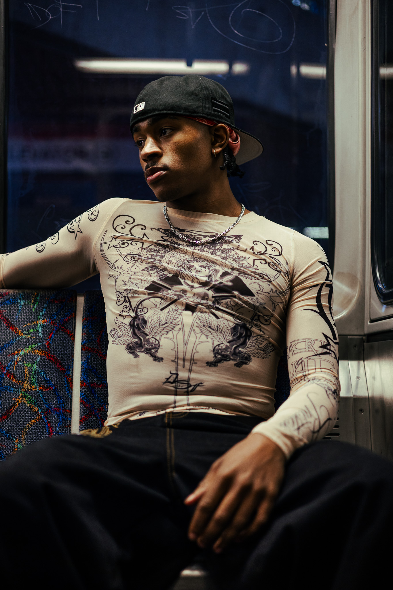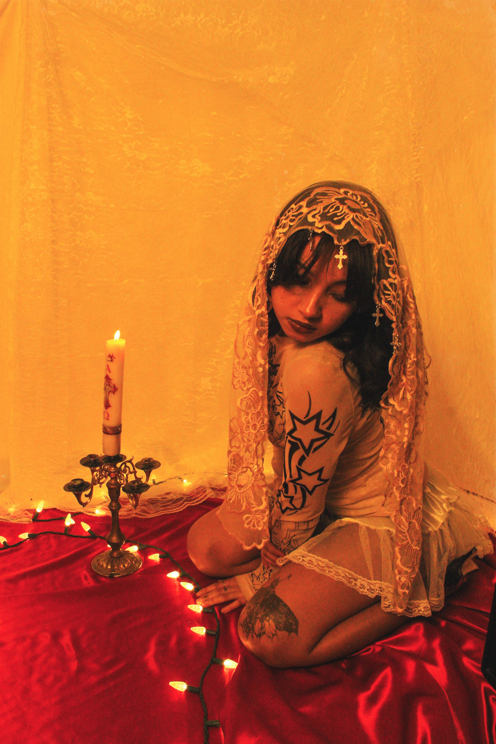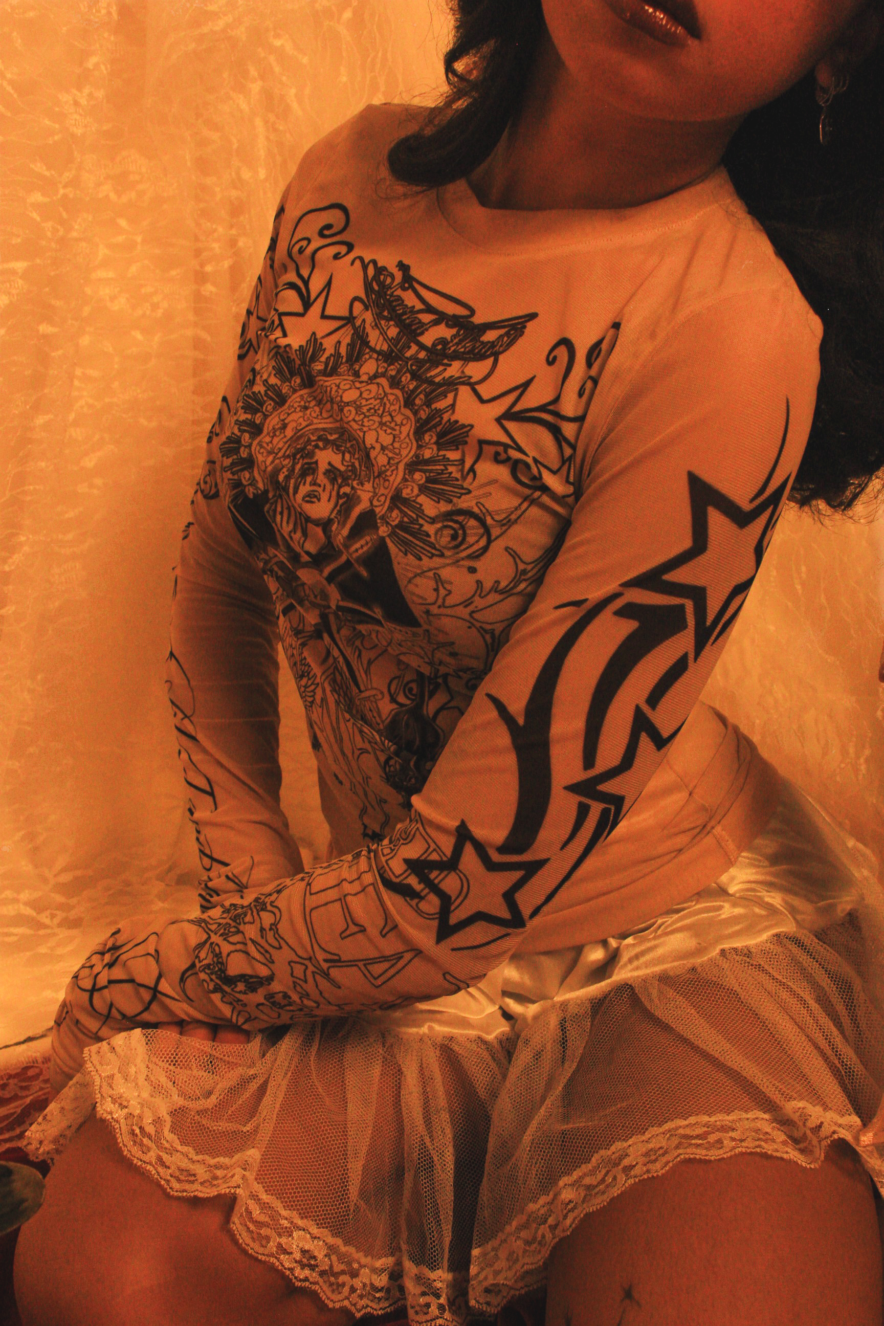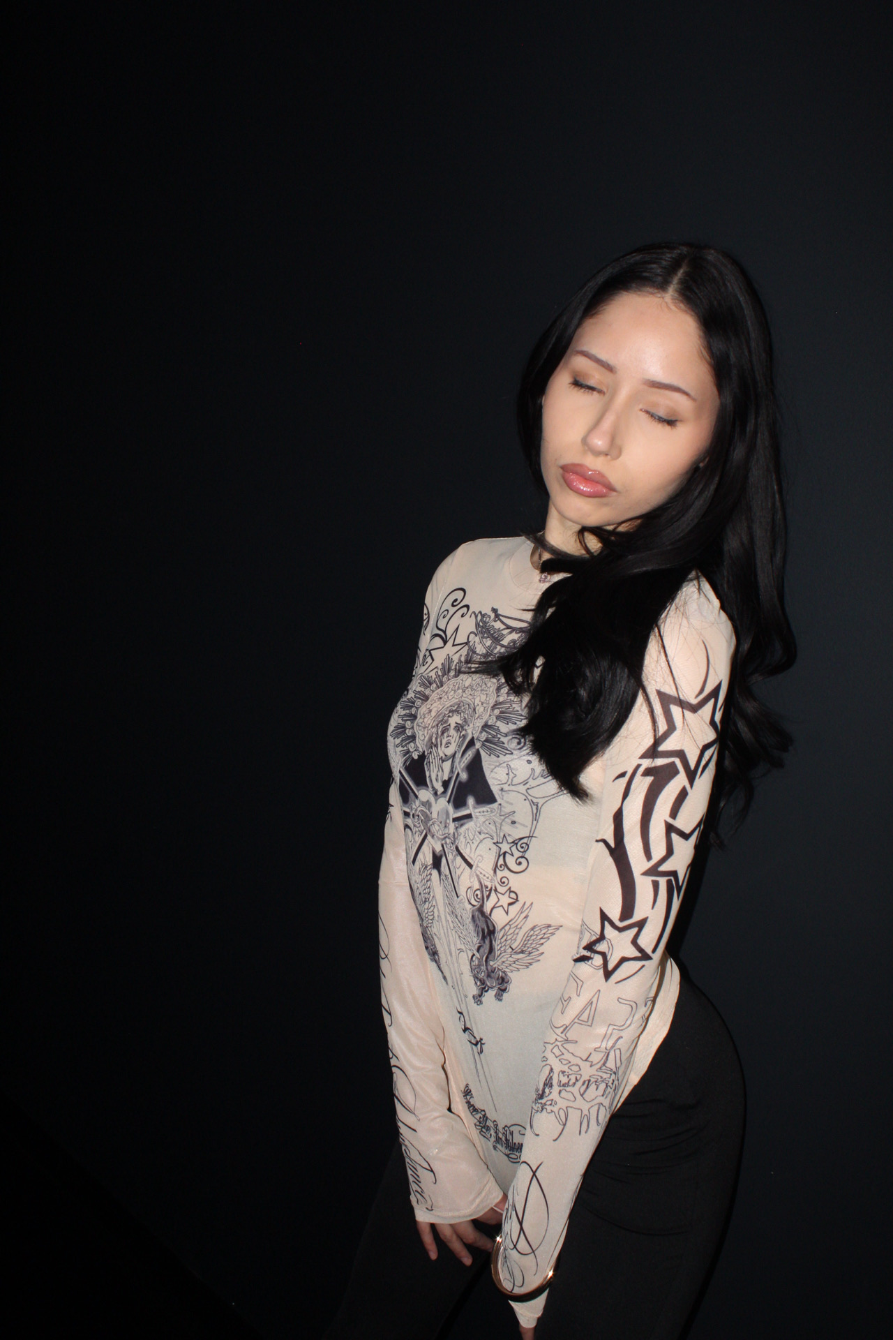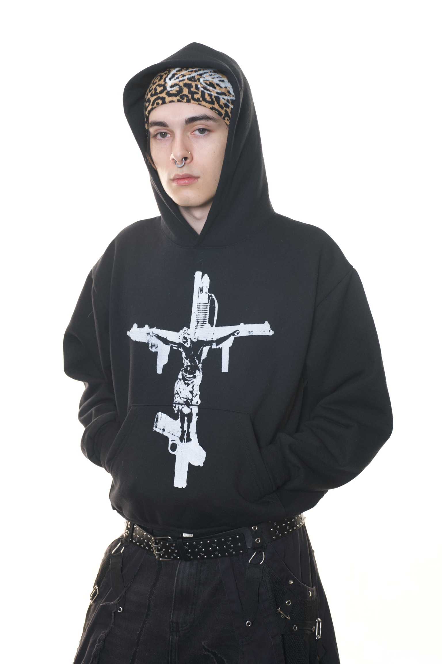 The visual language merges references from European Catholic iconography and Mesoamerican spirituality, recontextualized within streetwear and alternative fashion. These elements are not decorative, they function as a framework for reframing identity, transforming the body into something sacred, self-defined, and resistant.