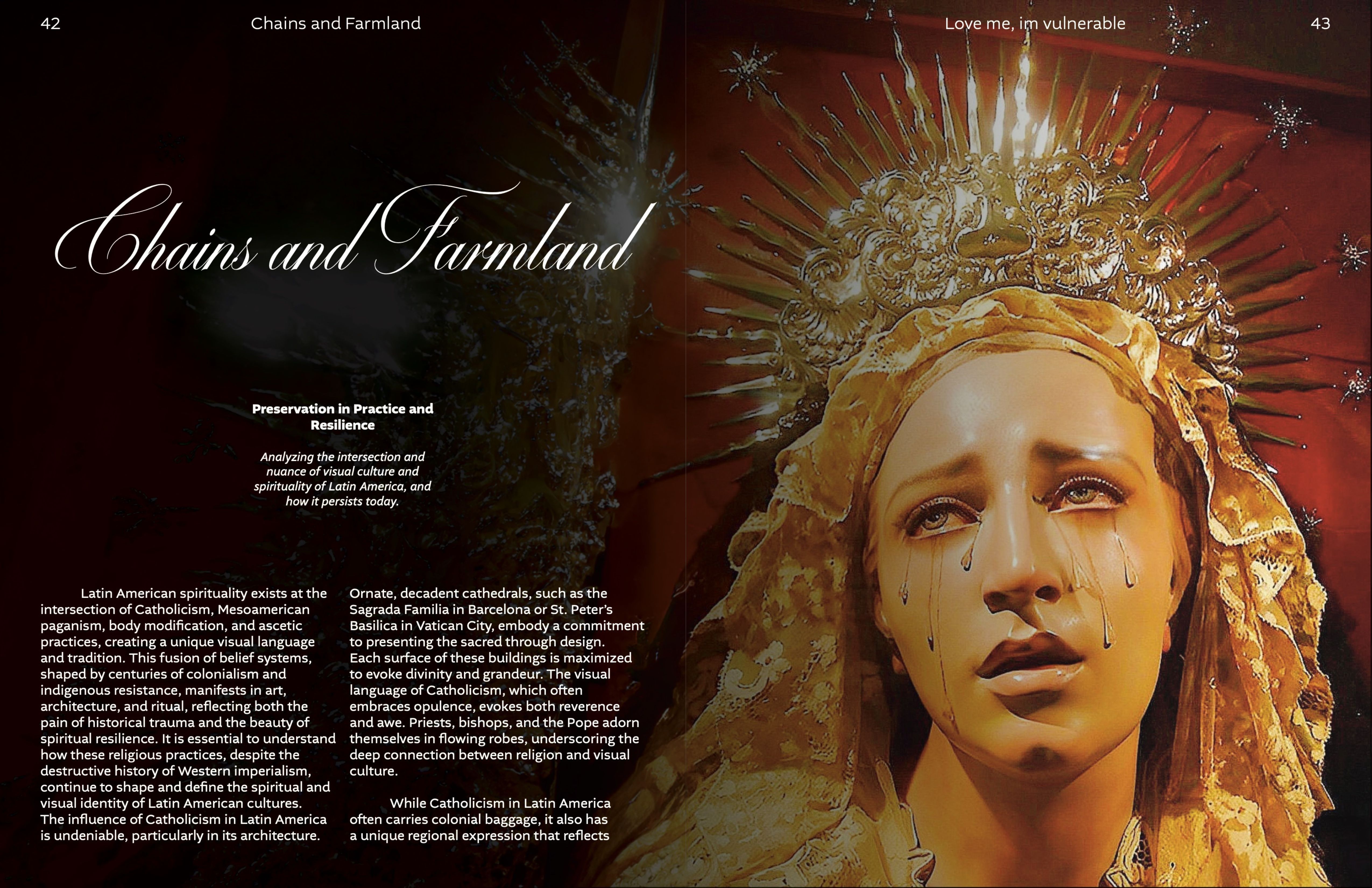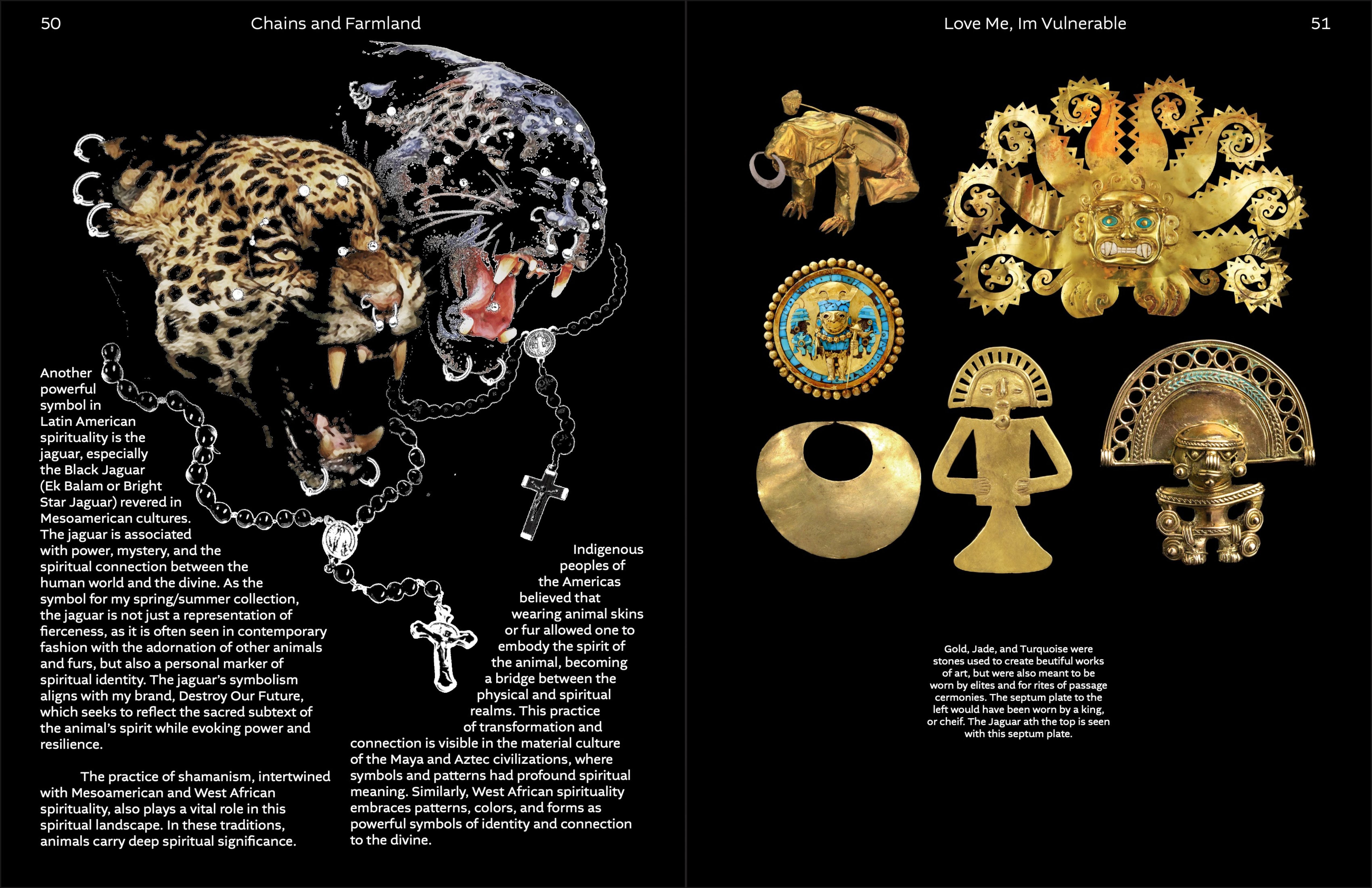 The visual language merges references from European Catholic iconography and Mesoamerican spirituality, recontextualized within streetwear and alternative fashion. These elements are not decorative, they function as a framework for reframing identity, transforming the body into something sacred, self-defined, and resistant.